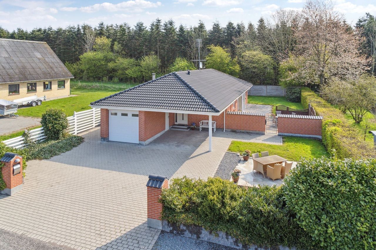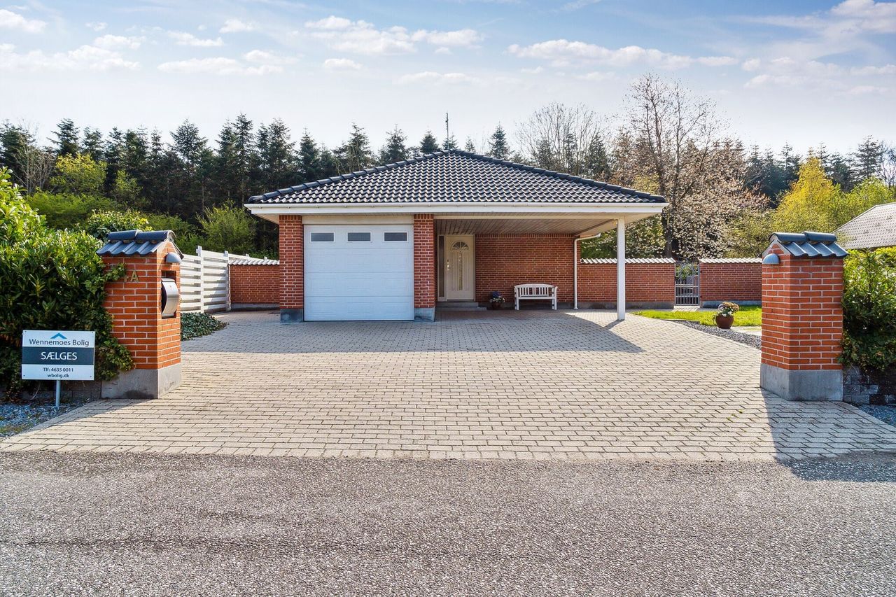 Ejendommen præsenterer sig med solidt, rødt murværk, og som I ankommer ad den flisebelagte indkørsel, parkeres bilen i carporten eller i garagen med elport. Der er gulvvarme i hele boligen, og atmosfæren er lys og indbydende på tværs af alle kvadratmeter.