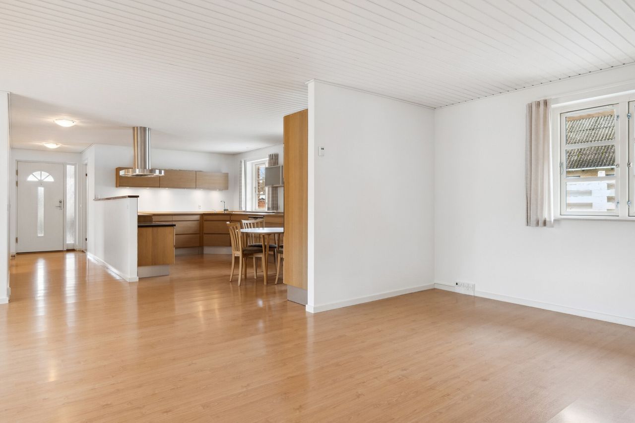 Entréen glider ubesværet over i det åbne opholdsmiljø med køkken og stue i forening. Dagslyset strømmer på tværs, ligesom terrassedøren forbinder jer med haven på et splitsekund. Køkkenet emmer af rene linjer med grebsløse skabselementer, en ovn i en arbejdsvenlig højde og et nedsænket kogeafsnit, og nærved kan spisebordet stå.