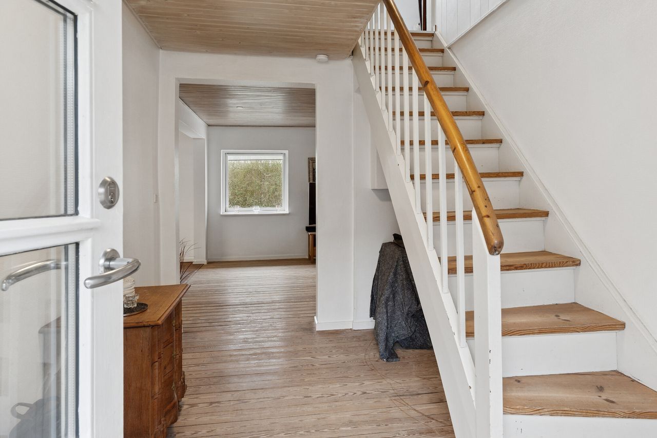De to fine værelser på førstesalen ledsages af endnu et i stueplan, så forældre og børn kan indrette sig i hvert sit domæne. I samme afsnit som entréen og bryggerset har I hjemmets badeværelse, der er et lyst og rart eksemplar med bruseafsnit.