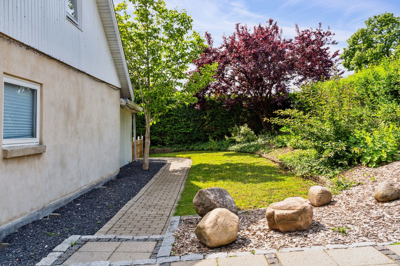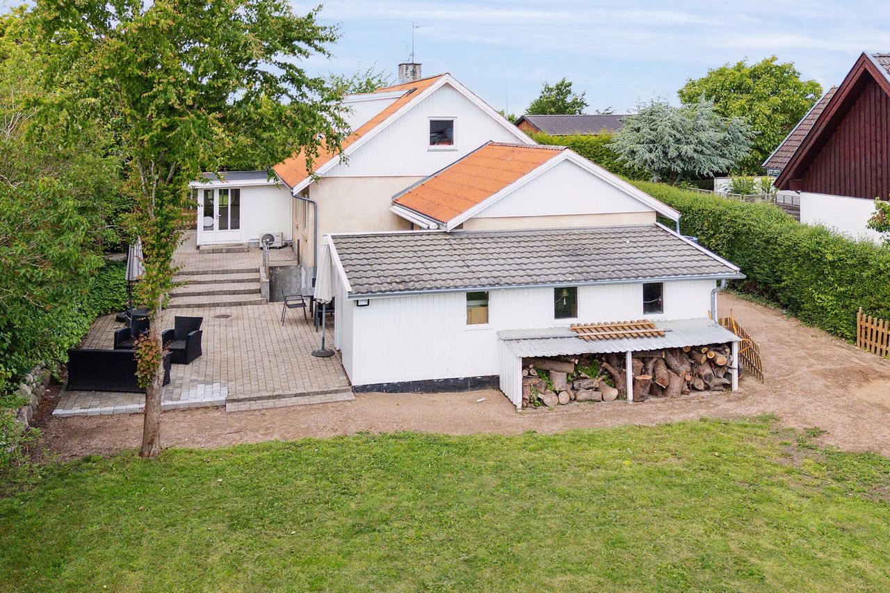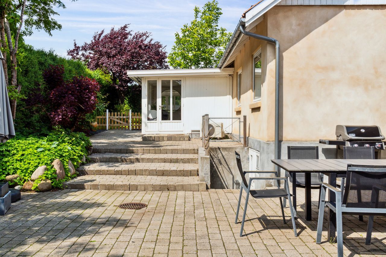 Terrassemiljøet strækker sig over store dele af haven, så der er rig mulighed for at opsøge solen hele dagen igennem. Udenfor venter også gode græsarealer og parkeringsmuligheder.