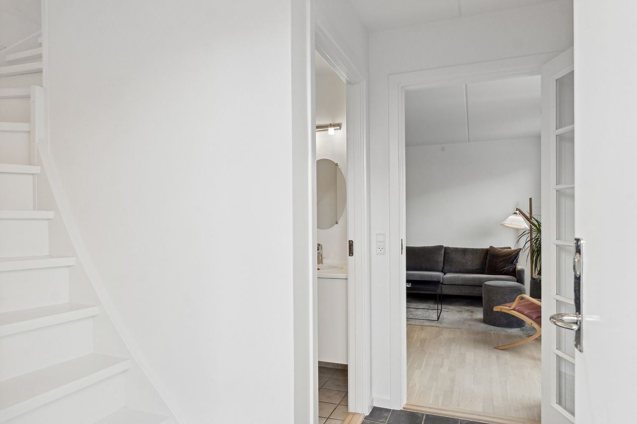 Huset er dejligt praktisk indrettet, så I får et badeværelse på begge etager, hvilket mindsker risikoen for kø en travl mandag morgen. Når dagen går på hæld, trækker I ind i de tre gode værelser, som alle er med kviste.